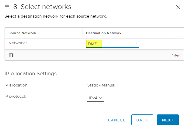 I will be using my DMZ port group for Network 1 as this deployment will be placed in the DMZ, Next…
