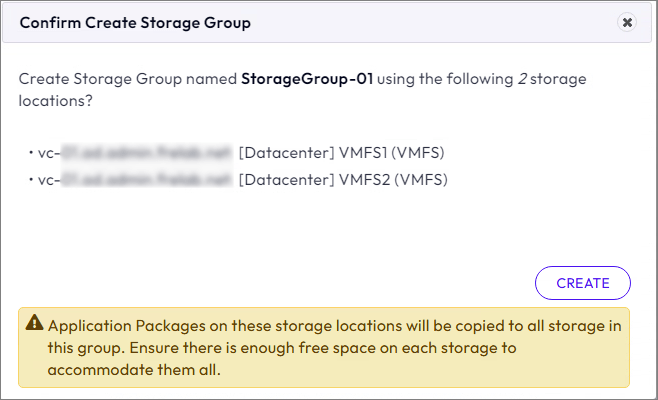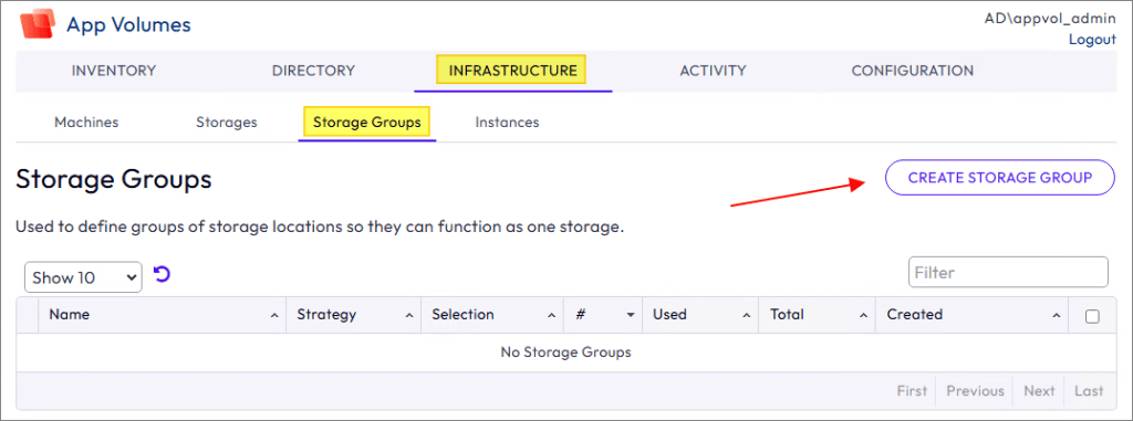 I begin by creating a new Storage Group to replicate existing App Volumes applications to the new datastore. Infrastructure > Storage Groups > Create Storage Group