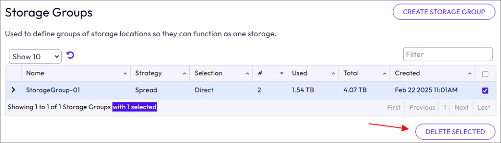 I can now remove the temporary Storage Group. Infrastructure > Storage Groups > Select the Storage Group > Delete Selected