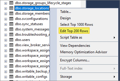 To finish up, I will now remove the metadata from the old datastore. I first connect to the SQL Database using SQL Server Management Studio to get the location ID of the old datastore that is being removed. In the tables list, I find the table named “dbo.storage_locations”. Right-click this table and select “Edit Top 200 Rows”