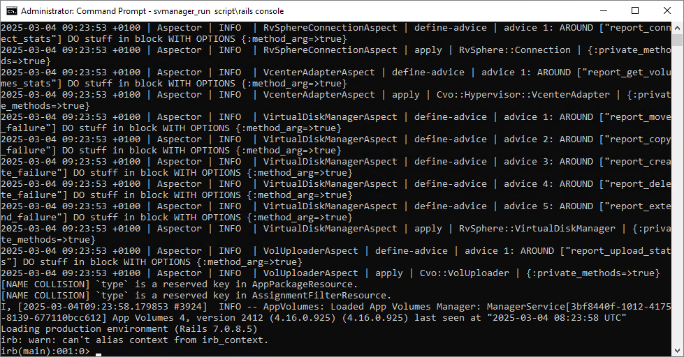 Next, I connect to the RVC console on one of the App Volumes Managers. (See Omnissa KB 2125212 for more information on the App Volumes RVC console). I open an administrative command prompt and navigate to the App Volumes Manager program directory: C:\Program Files (x86)\CloudVolumes\Manager. I launch the RVC console: svmanager_run script\rails console