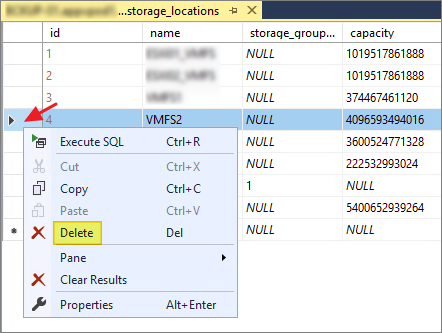 To finish up, I will now remove the metadata from the old datastore. I first connect to the SQL Database using SQL Server Management Studio to get the location ID of the old datastore that is being removed. In the tables list, I find the table named “dbo.storage_locations”. Right-click this table and select “Edit Top 200 Rows”