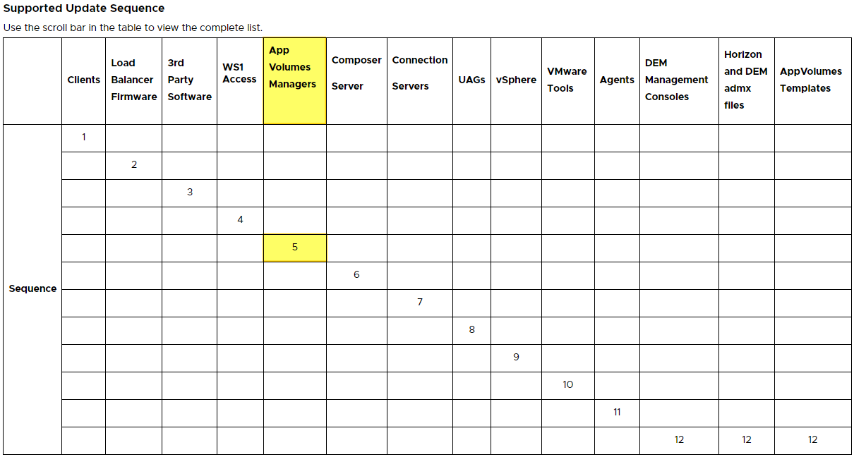 Welcome to my Omnissa App Volumes series. In this session I will describe the steps I took to upgrade my App Volumes Managers to v.2506 (4.18.0.1692). According to Omnissa’s official documentation, this should be done as step 5 in the supported update sequence, as shown below.