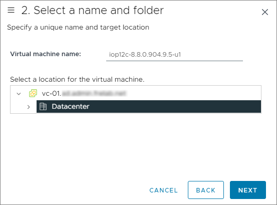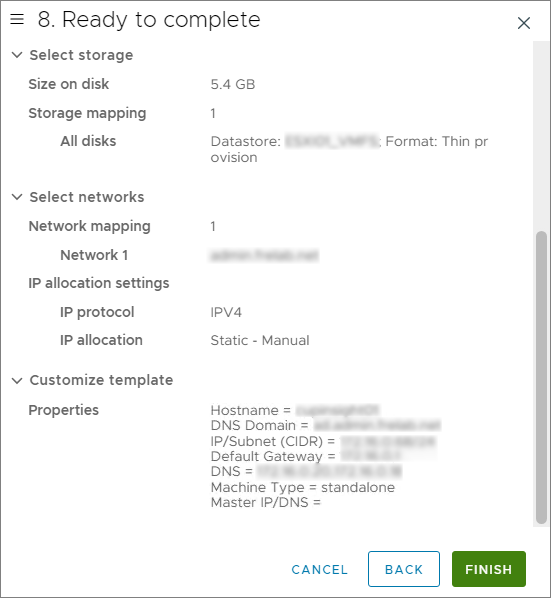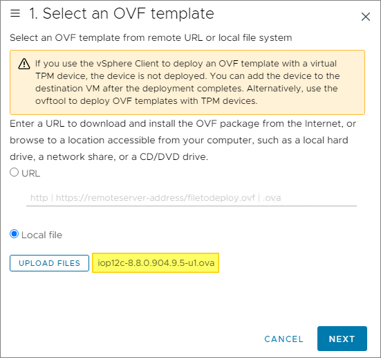 In vCenter, I select Deploy OVF Template. Browse and select the OVA file, Next…