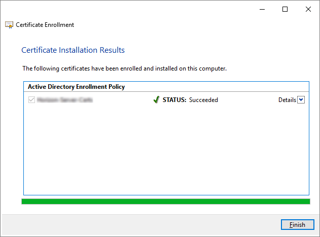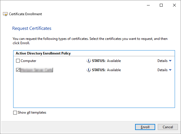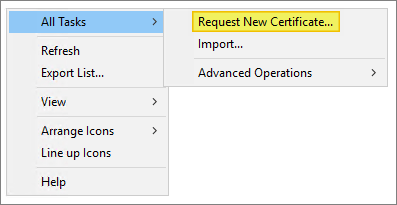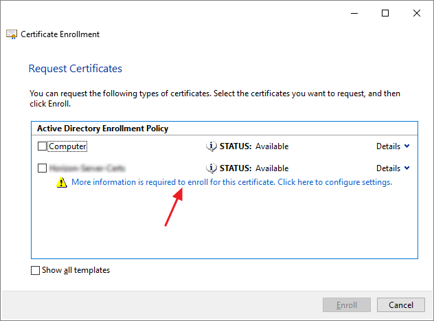 As the Solve server isn’t domain joined, and therefore not eligible for enrollment through AD, I will request the certificate from a server that has enrollment permissions on the certificate template I want to use. I start out by running certlm.msc. I wont go into details about requesting the certificate, but do a quick run through with screenshots below. The most important step during this is to set both Common Name and DNS to the Solve server’s FQDN.