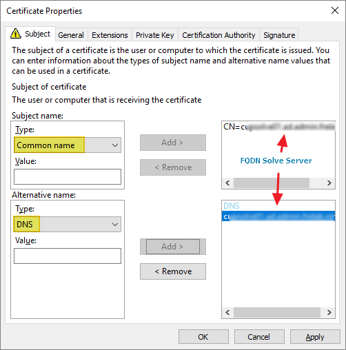 I provide the Solve server’s FQDN as both Common Name and DNS. I also set a recognizable Friend Name