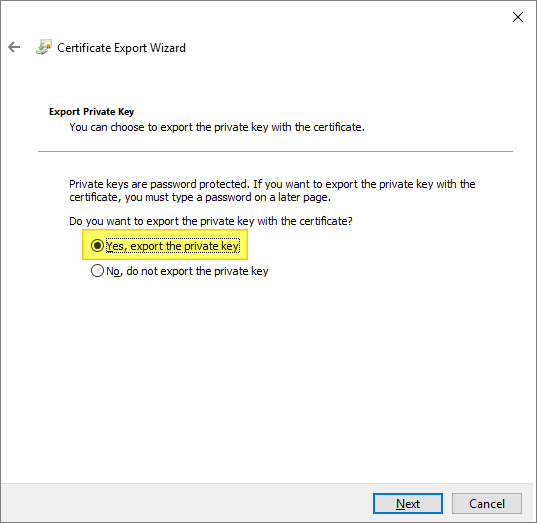 Next, I will Export the Certificate and Private Key to a pfx-file