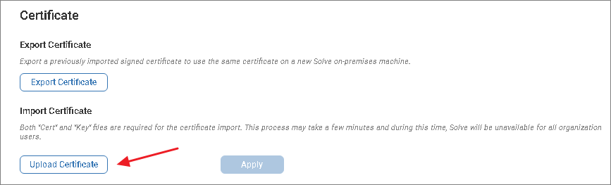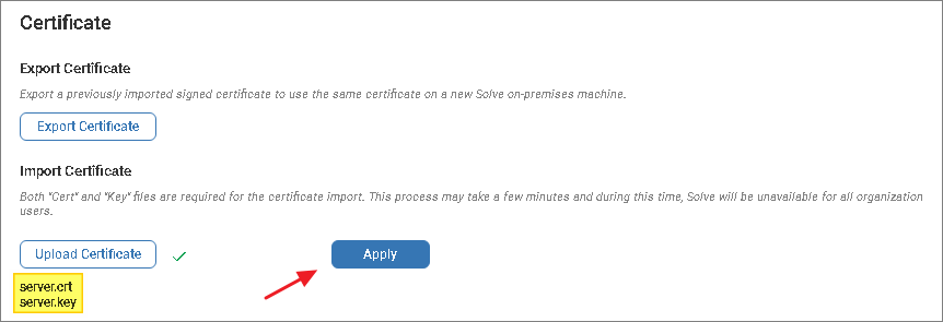 Now that I have both the server.crt and the server.key file ready, I log into Solve and from the Settings page, I upload the certificate and key file.