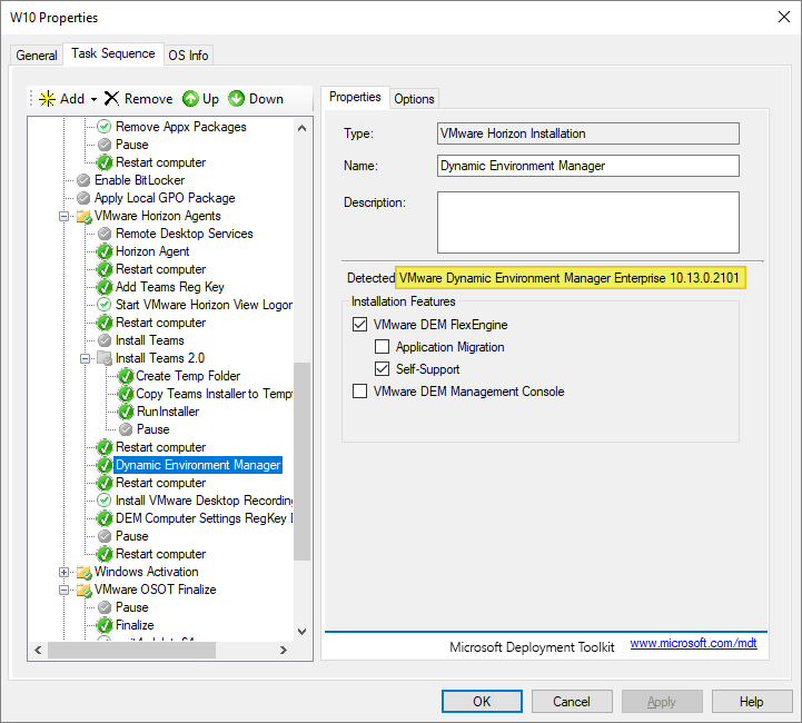 As I’ve gone over to using MDT to create Horizon Windows images, described here: Automating Template Creation & Maintenance, I will update the Dynamic Environment Manager Agent in the Deployment Share, and run through the task sequence to create a new Windows image. Before I begin, I open the task sequence and can see that it has found the 10.12.0.1133 build in the Deployment Share.