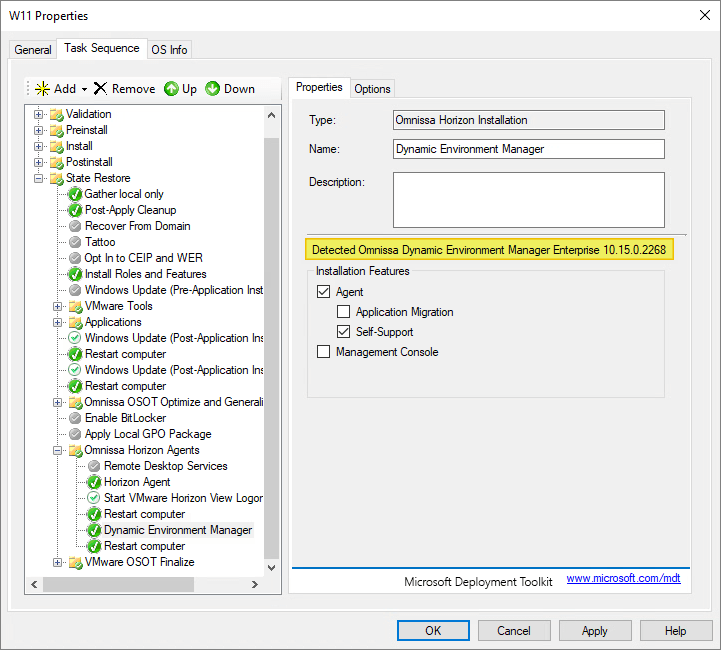 As I’ve gone over to using MDT to create Horizon Windows images, described here: Automating Template Creation & Maintenance, I will update the Dynamic Environment Manager Agent in the Deployment Share, and run through the task sequence to create a new Windows image. Before I begin, I open the task sequence and can see that it has found the 10.13.0.2101 build in the Deployment Share.