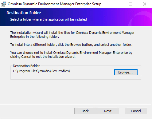 When the Omnissa Dynamic Environment Manager Enterprise Setup Wizard launches, I accept the license terms, Next…