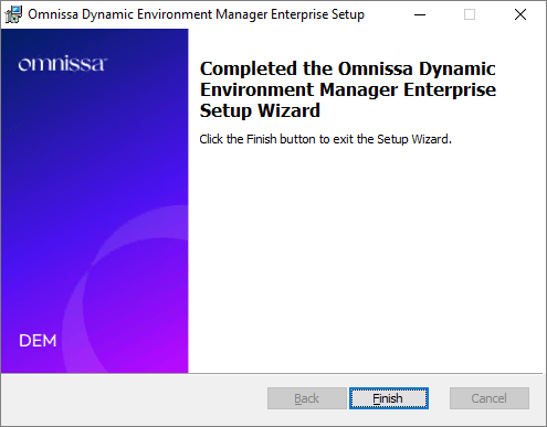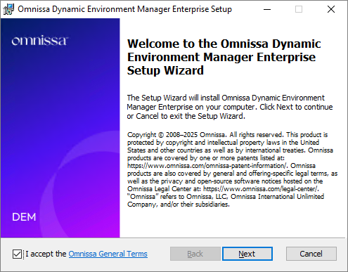 When the Omnissa Dynamic Environment Manager Enterprise Setup Wizard launches, I accept the license terms, Next…