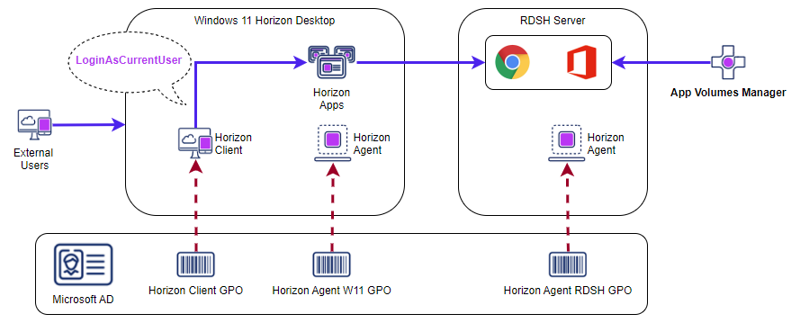 Welcome to my Omnissa Horizon series. In this session I will describe how I installed and configured the Horizon Client inside a Horizon Desktop to use the LoginAsCurrentUser-feature when launching Horizon Applications from an RDSH-server. This setup is done using the 2412 version of Client, Agent, Connection Server and DEM. The drawing below shows the components involved and how they interract.