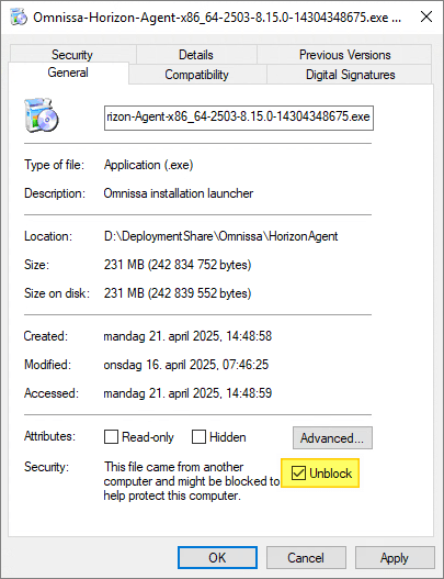 Next, I copy the new VMware Horizon Agent executable to the “HorizonAgent” folder in the Deployment Share. It is important to make sure that the executable isn’t blocked by Windows Security, therefore I right-click the exe-file, select Properties and tick the Unblock box, if it exists. This also applies to the other executable files under the “D:\DeploymentShare\Omnissa” folder.