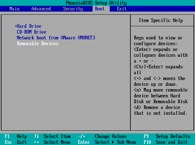 Once the virtual machine is created, I power it up. I open the VMware Virtual Console and can see the BIOS-screen, I select the Advanced Tab