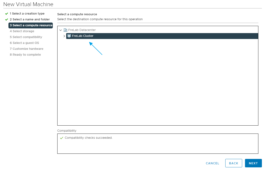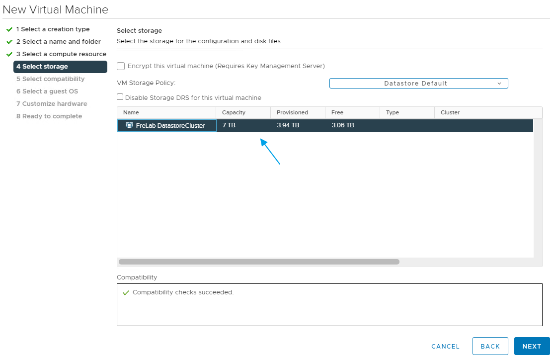 I choose a storage location, in my case this will be my Datastore Cluster, Next…