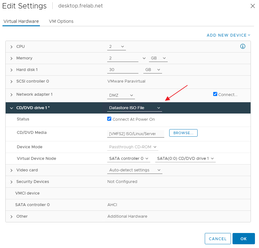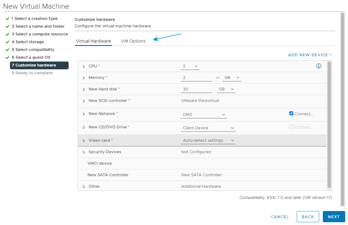 From the Virtual Hardware tab, I adjust the virtual hardware according to my needs. Note that I don’t attach any ISO to the CD/DVD Drive at this time. I select the VM Options Tab…