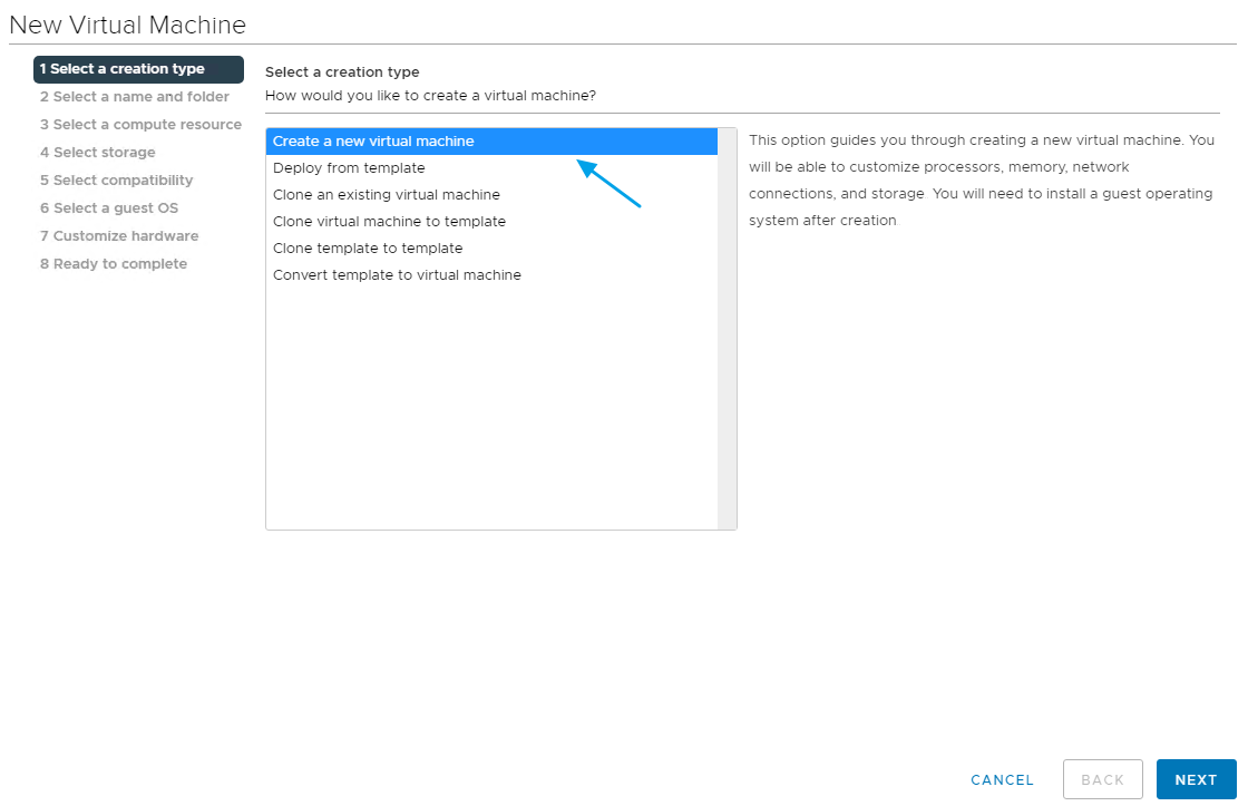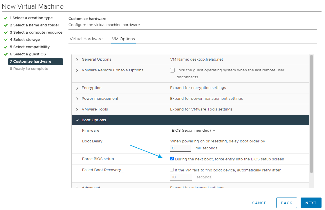 In VM Options, I select to boot to BIOS next time, Next…