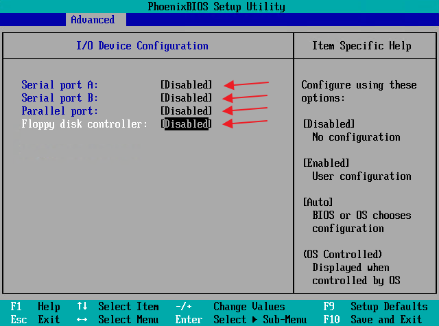 I disable all serial, parallel and floppy devices, once done, I hit ESC to return to the previous screen.
