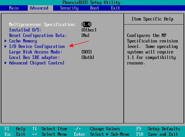 From the Advanced tab, I select I/O Device Configuration…