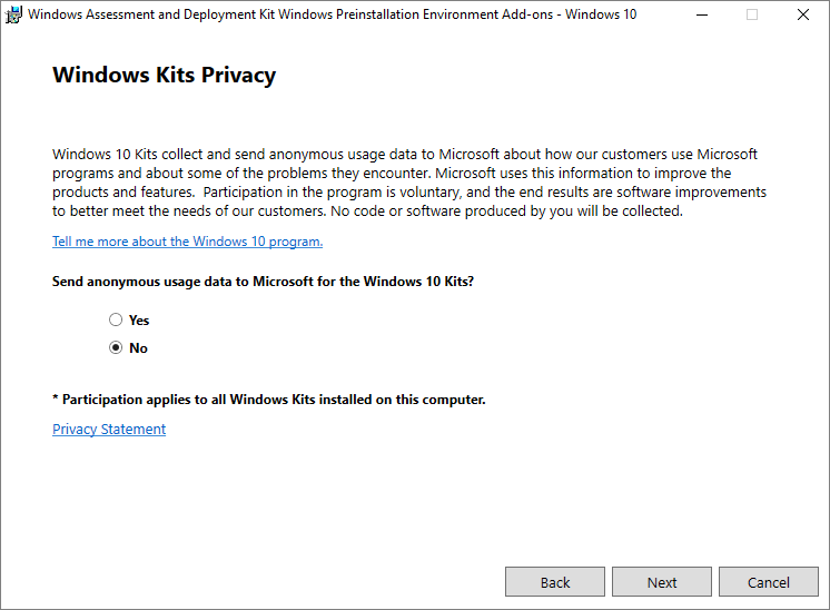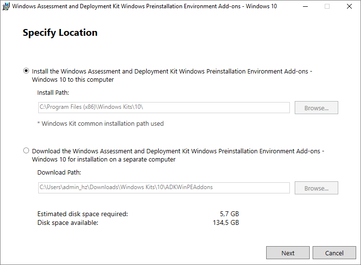To install the Windows Preinstallation Environment (PE) ADK Add-on, I run ADKWINPESETUP.exe, accept the proposed installation path ensuring that I have adequate disk space, Next…