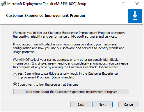 I launch MicrosoftDeploymentToolkit_x64.exe to start the Setup Wizard for the Microsoft Deployment Toolkit, Next…