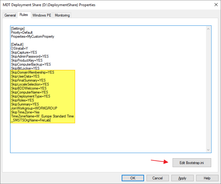 I configure the rules with the additional settings below and click Edit Bootstrap.ini