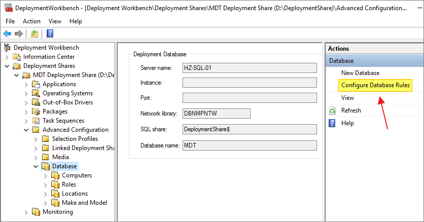 For this set up, I will be creating a new database with the very “imaginative” name, MDT, Next…
