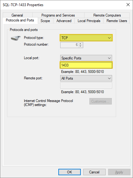 Finally I make sure the Windows Firewall has rules for both TCP and UDP port 1433