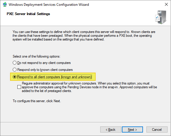 For this to work with VMware Horizon Automated Template Creation, I select “Respond to all client computers”, Next…
