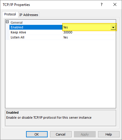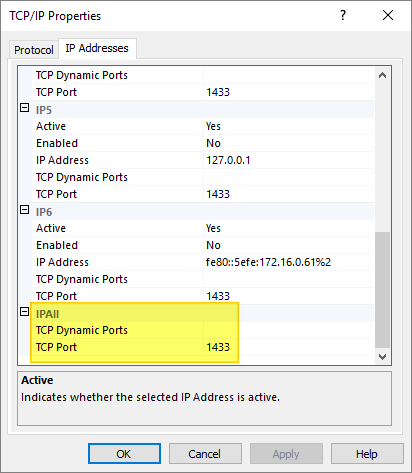 I also verify that TCP/IP is enabled and that the Dynamic TCP ports are set to port 1433.