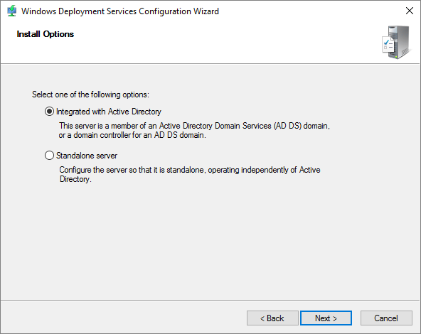 As WDS isn’t configured, I launch the Windows Deployment Services MMC, right-click my server, Configure Server…