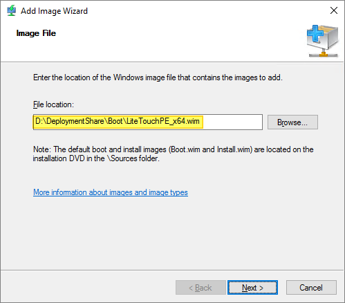 I click Browse, navigate to the Boot-folder under the deployment share and select my boot image