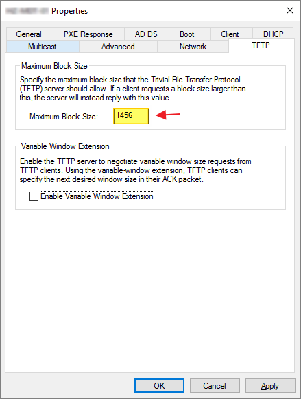 From the TFTP-tab I adjust the Maximum Bloc Size to “1456” and deselect “Enable Variable Window Extension”, OK…