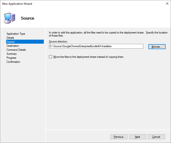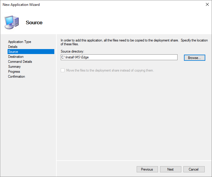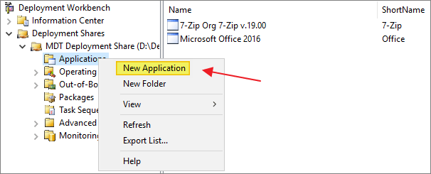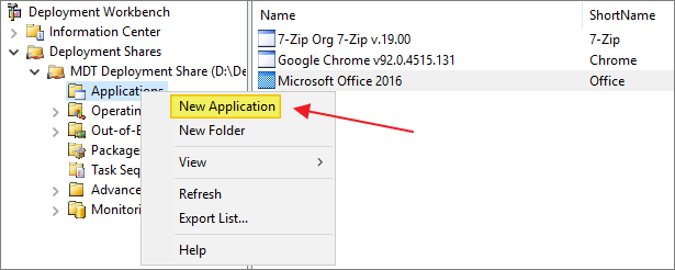 I repeat the process I used to add 7-Zip and Chrome above, just adjust the command line. In Deployment Workbench, I launch the “New Application” wizard.