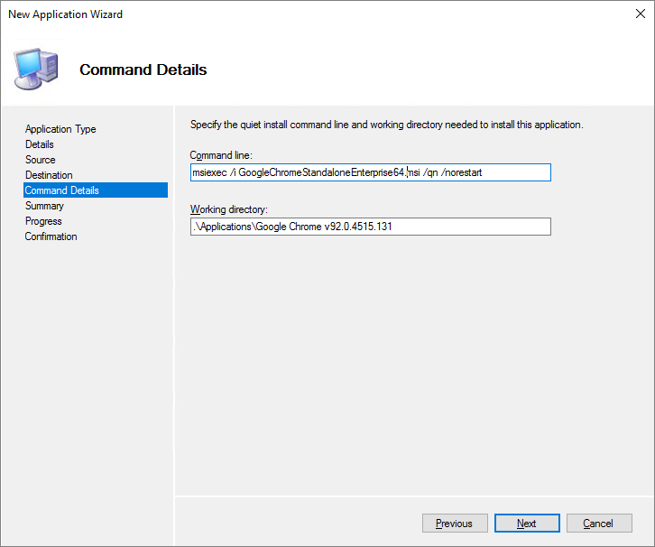 Fill in the command line parameters for silent install and the working directory information, Next…