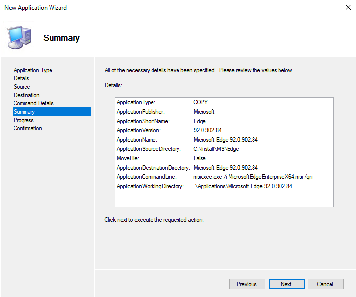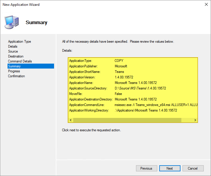 I fill in the command line parameters for the silent install and the working directory information, Next…