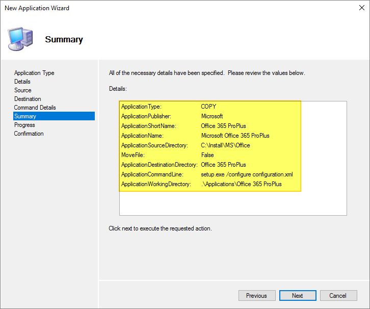 Fill in the command line parameters for the office installation and the working directory information, Next…