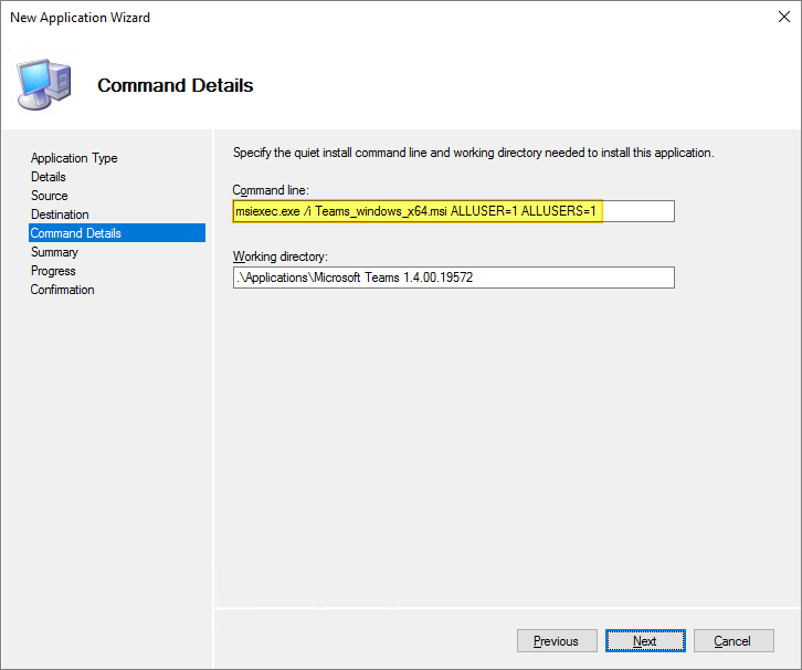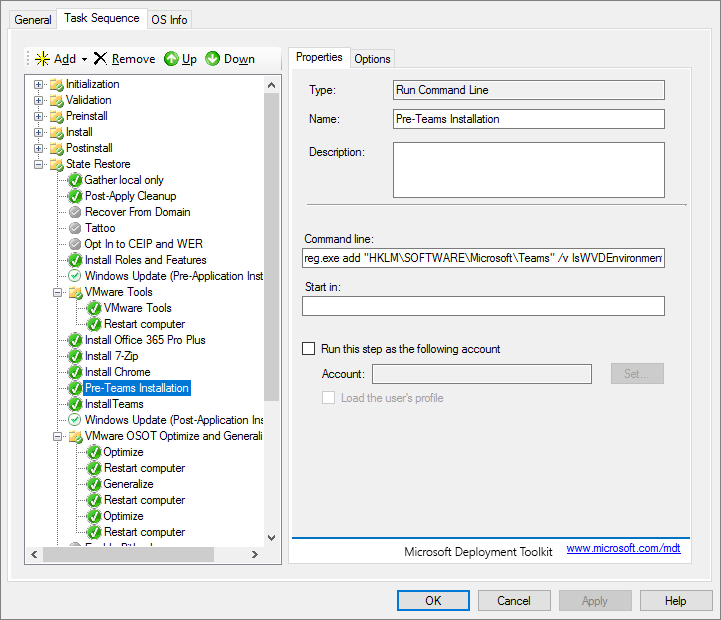 Adding MS Teams to a VDI Task sequence is a little different from the above example, because this requires that I add a registry setting before pushing the Teams Machine-wide installer, described by Microsoft here: Teams for Virtualized Desktop Infrastructure