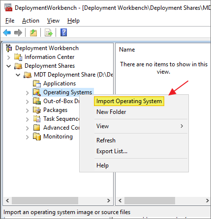 Once the applications are added to my deployment successfully, I will add a operating system. Before I start the process of adding a operating system, I have connected the Windows 10 Build 2004 ISO to the MDT-server. To add an operating system, I launch the “New Operating System” wizard inside the Deployment Workbench.