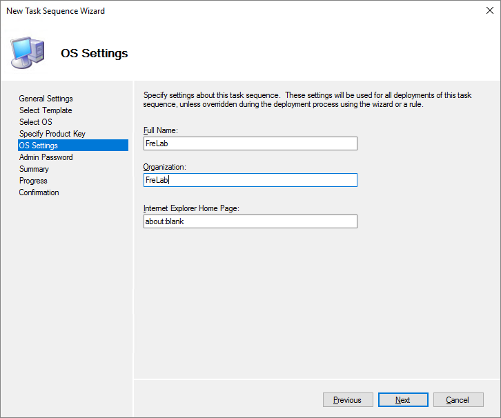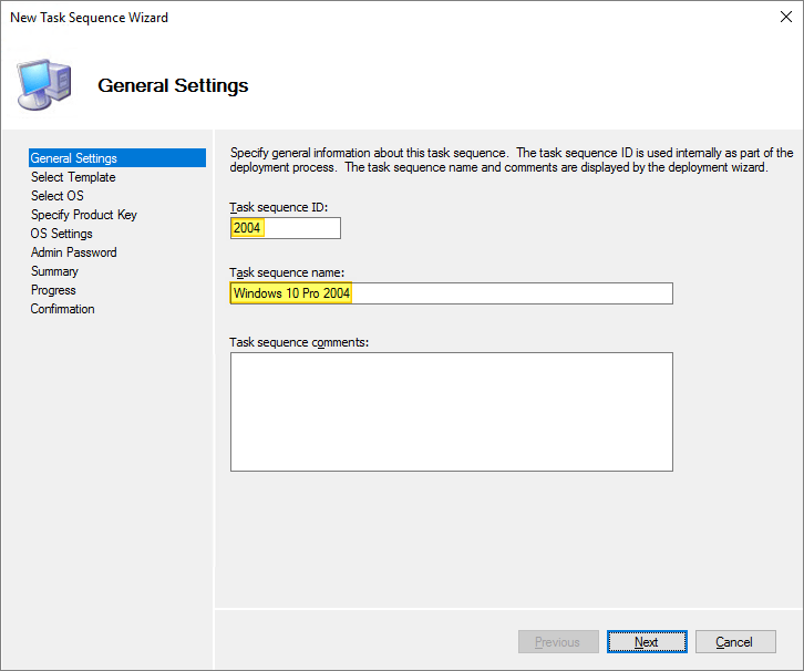When the “New Task Sequence” wizard launches, I specify my general information, Next…