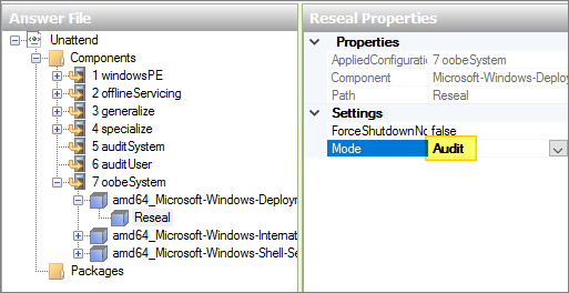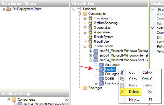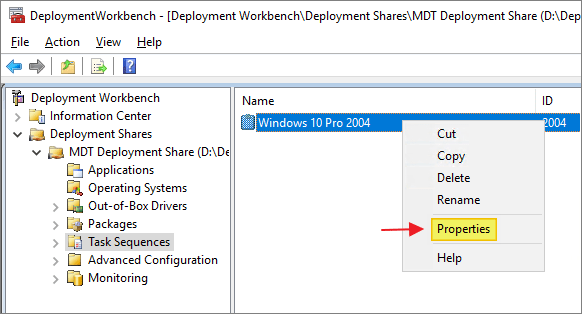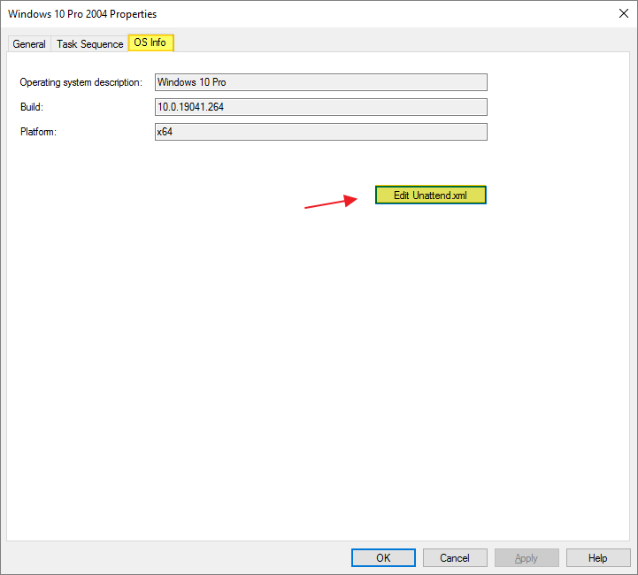 During a manual creation of a VMware Horizon template, it is critical to boot Windows into Audit Mode before applying the VMware OSOT optimizations etc. I will do the same here by editing the unattend.xml. First I generate a catalog for the operating system image and use Windows System Image Manager (SIM) to edit the answer file for an unattended installation. I right-click my task sequence and click Properties.