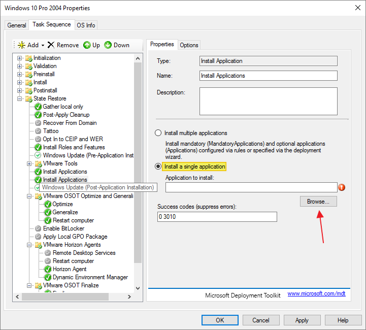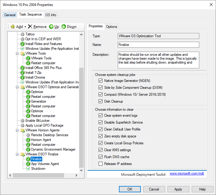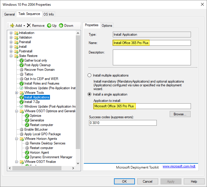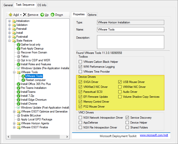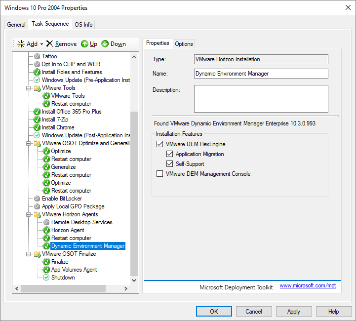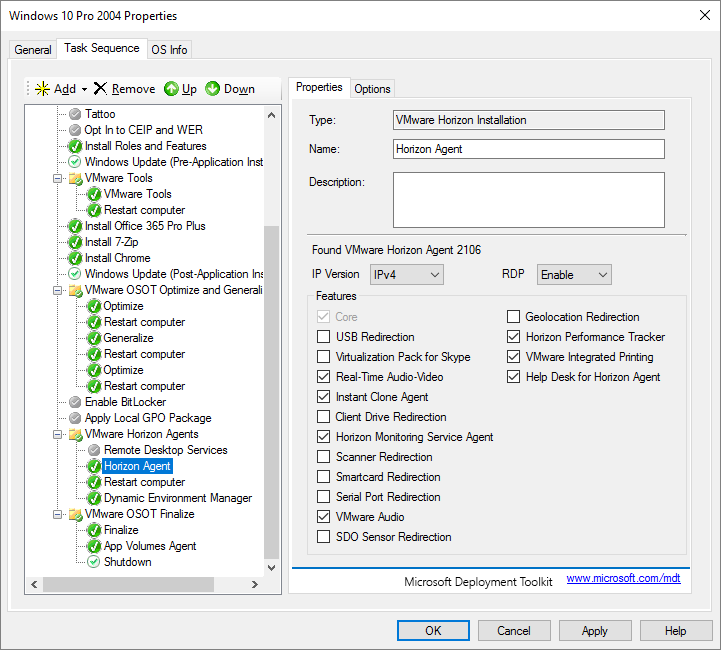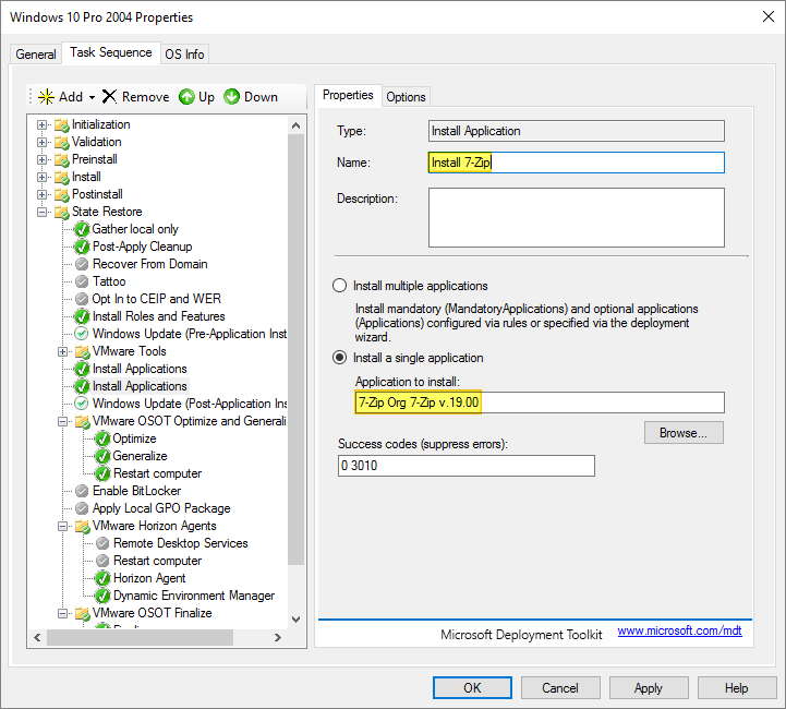 Welcome to my Microsoft Tips & Tricks section. In this session I will describe how I added applications, operating systems etc. to my deployment share, and how I created a VMware OSOT Task Sequence to automate the creation of my VMware Horizon templates. The goal of this session is to end up with a Windows 10 Build 2004 with MS Office, 7-Zip, Chrome and Edge Chromium, which I can use as a template with VMware Horizon. As this session is a part of my bigger session VMware Horizon – Automating Template Creation & Maintenance, it will be focused on the configuration used when creating new templates for VMware Horizon. I suppose some element can be used when configuring a task sequence for physical clients, but that isn’t the focus or reason for making this session.