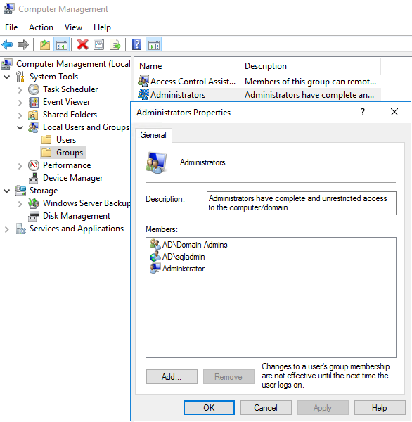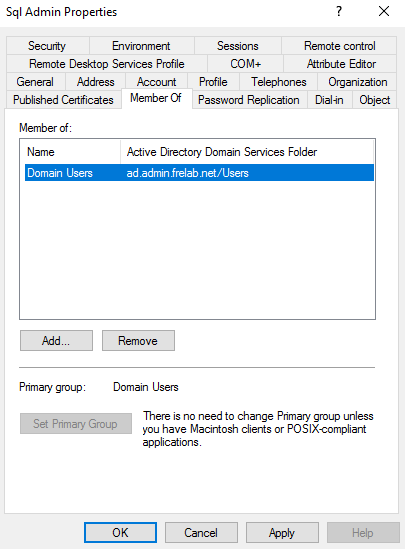I will create a separate SQL Admin user that I will use when installing SQL Server. In a production setup, I would probably set up a SQL Admins Group for these SQL-servers, and give this group the Admin permission during installation. The SQL Admin account is a normal Domain User, but I add the account to the Administrator group locally on both servers. This could also be done by using the Restricted Groups setting in a GPO.