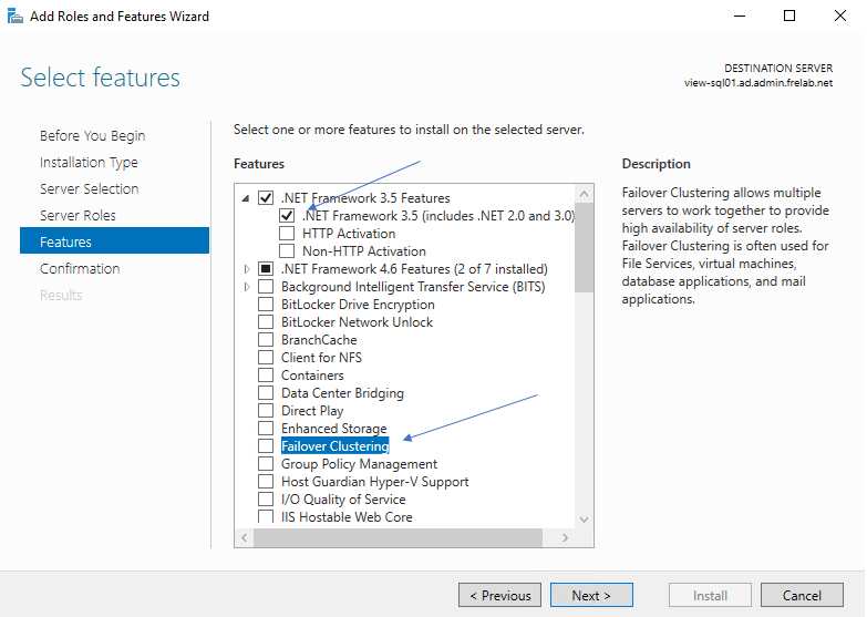 I will need to add both .Net 3.5 and the Failover Clustering feature on both servers, from Server Manager I add these features first.
