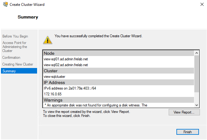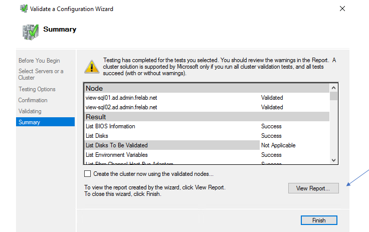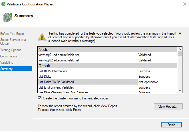 Next, I select “Create the cluster now using the validated nodes”, Finish…