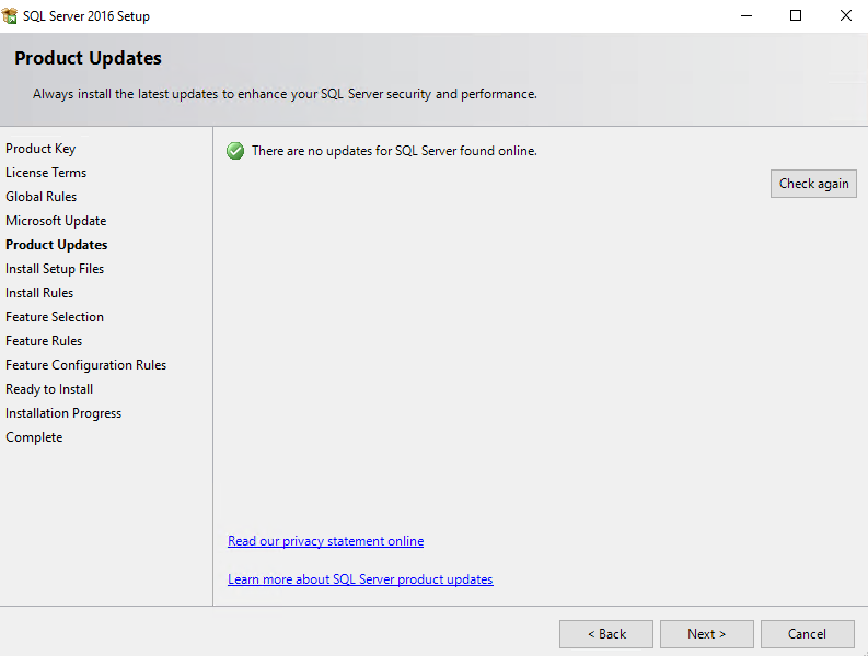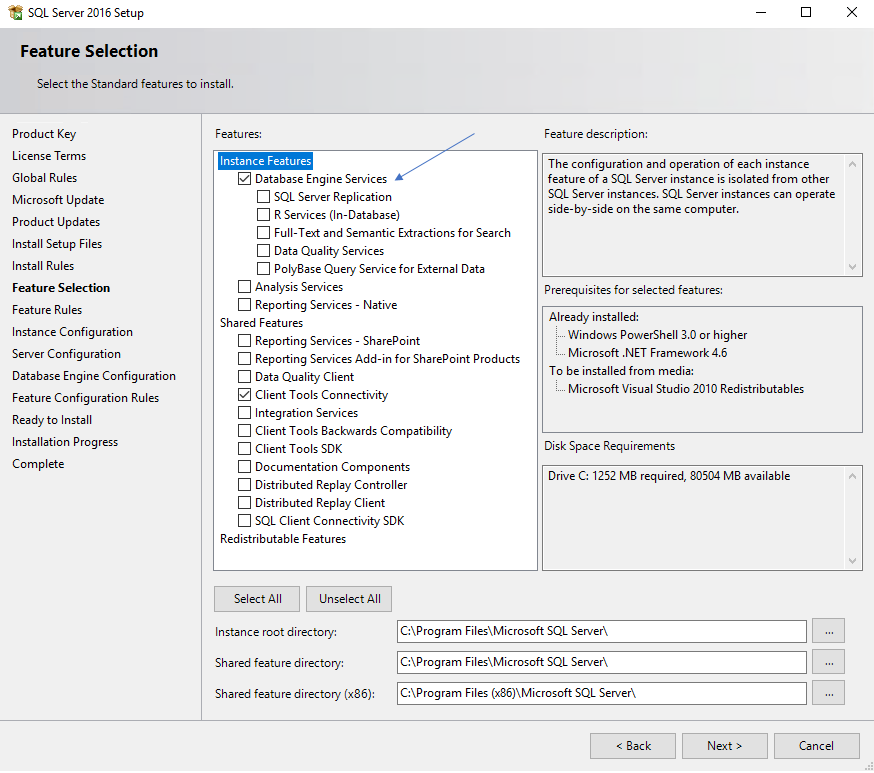 I will only need the Database Engine Services, the installation paths are ok, Next…