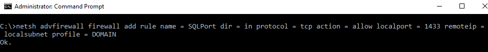 netsh advfirewall firewall add rule name = SQLPort dir = in protocol = tcp action = allow localport = 1433 remoteip = localsubnet profile = DOMAIN