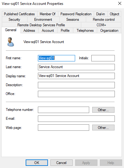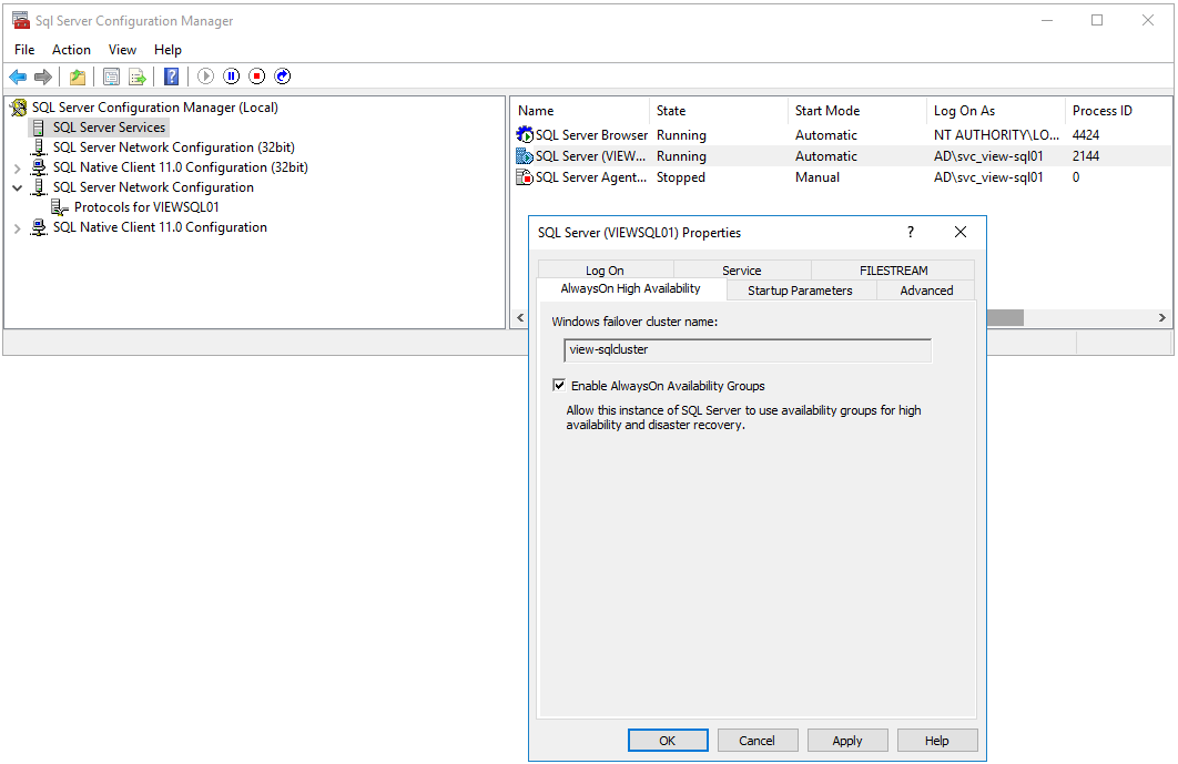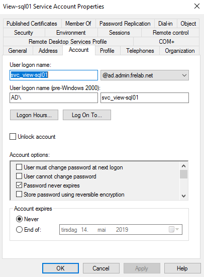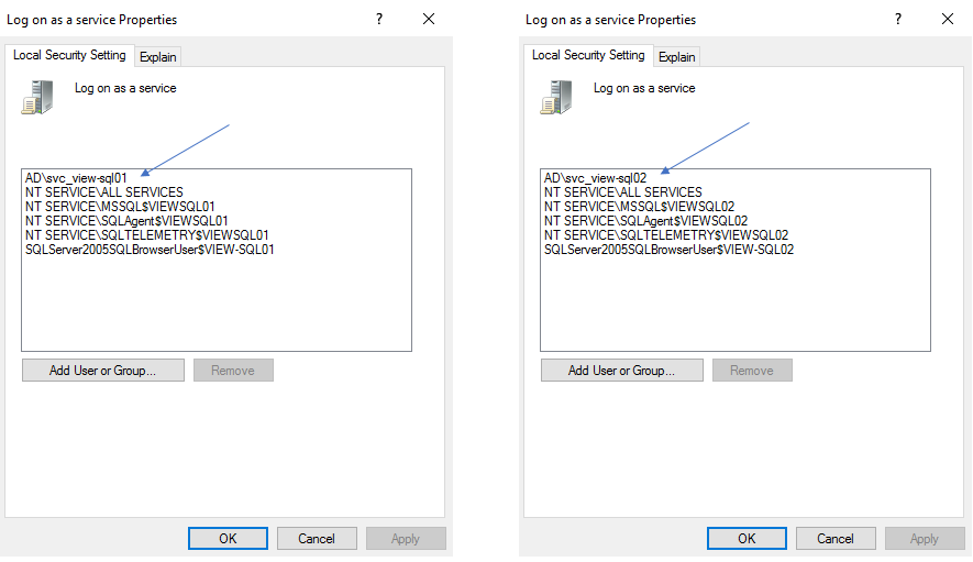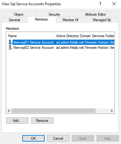 I will also create separate service-accounts for each server and group these in a group that is given sysadmin-permissions in SQL, below. I name the service-accounts: svc_view-sql01 & svc_view-sql02.