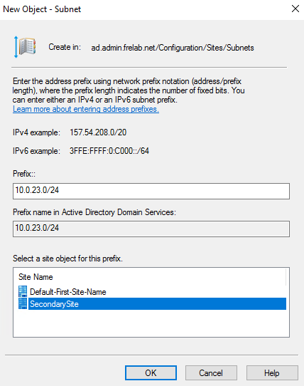 Before I begin, I prepare “Active Directory Sites and Services” with my new site and subnet. First I will create a new site. Open the MMC and right-click sites – “New Site”